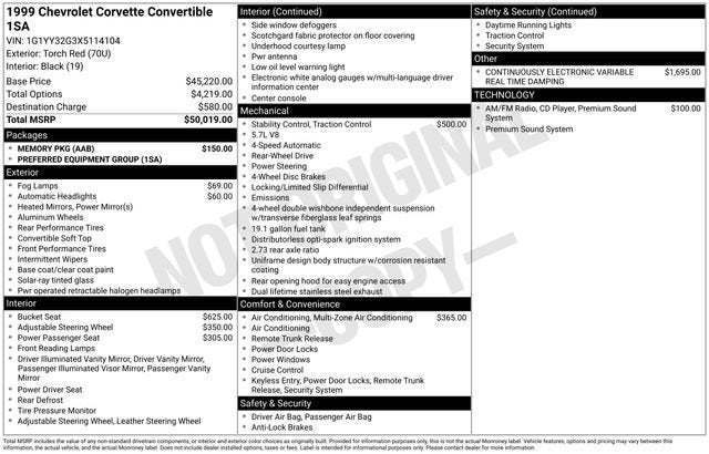 1999 Corvette Convertible. Torch Red/ Black Leather Sport Seats/ Black Top. 345 HP LS1, Automatic, Magnetic Selective Ride Control Suspension, Active Handling, P/ Telescope Steering Column, Twilight, P/ Lumbar Seats, Bose CD, Dual Zone Air, Heated Seats, Memory, Fog Lamps, Floor Mats, Clear Bra, Twin Cone Performance Air Intake, B&B Tri Flow Performance Exhaust, Chrome Z06 Wheels. Local Trade. Sold At Jerry's. Only 61,500 Miles.