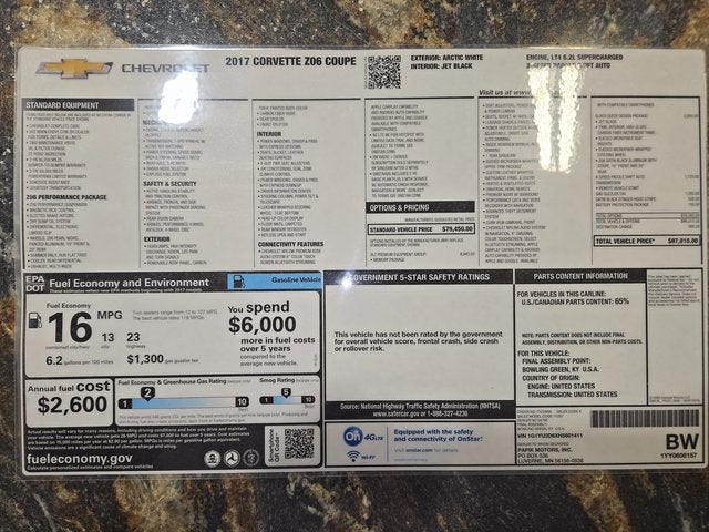 2017 Corvette Z06 Coupe. Arctic White w/ Satin Black Hood Stinger Stripe/ Jet Black Napa Leather w/ Suede Sport Seats. One Of 98 Z06 Coupes Produced With The Jet Black Suede Design Package, 650 HP Supercharged LT4, 8 Speed Paddleshift Automatic, Magnetic Selective Ride Control Suspension w/ PTM & Launch Control, 3LZ Preferred Equipment Group, Heads Up Display, P/ Heated & Ventilated Seats, Bose Centerpoint Audio System w/ NAV & Steering Wheel Controls, Performance Data Recorder, XM Satellite Radio, Onstar, Bluetooth®, Suede Flat Bottom Steering Wheel, P/ Tilt & Telescope Steering, Dual Zone Air, Memory, Gloss Carbon Fiber Dash Trim, Floor Mats, Front Park Assist Camera, Battery Protection Package, Tinted Glass, Tinted LED Side Marker Lamps, Carbon Flash Metallic Badging, Clear Bra, Dual Mode Performance Exhaust, Slotted Brake Rotors, Red Brake Calipers, Satin Black w/ Red Stripe Z06 Wheels. Local Trade. Sold New At Jerrys. MSRP $97,010. Warranty Start Date 12/19/2016. Only 6,700 Miles.