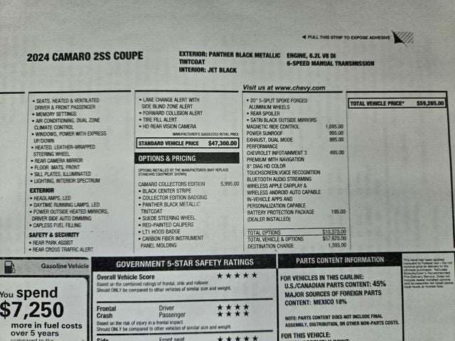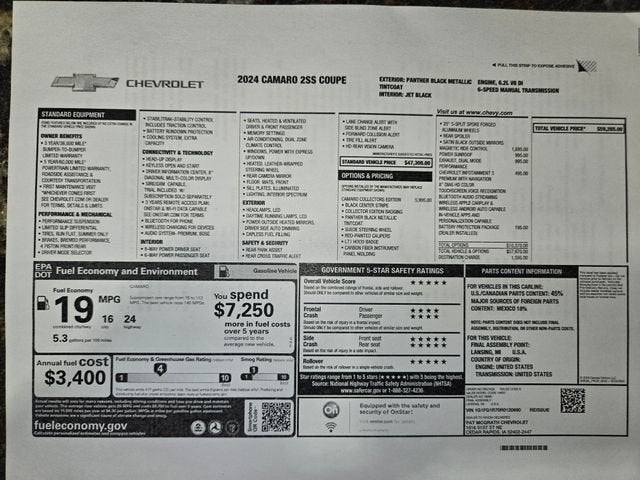 2024 Camaro 2SS Coupe Collectors Edition. Special Edition Car To Commemorate The Last Camaro. One Of Only 405 Produced. Panther Black Metallic w/ Satin Black Center Stripe/ Jet Black Leather. 455 HP 6.2L V8, 6 Speed Manual, Magnetic Selective Ride Control Suspension, Heads Up Display, P/ Heated & Ventilated Seats, Bose Audio System w/ NAV & Steering Wheel Controls, XM Satellite Radio, Onstar, Bluetooth®, Heated Suede Steering Wheel, Suede Shift Knob, P/ Tilt & Telescope Steering, Dual Zone Air, Memory, Carbon Fiber Dash, Embroidered Floor Mats, Ambient Interior Lighting, Wireless Phone Charger, Rear Camera Mirror, Illuminated Sill Plates, P/ Sunroof, Keyless Entry w/ Remote Start, Satin Black Mirror, Rear Spoiler, Dual Mode Performance Exhaust, Red Brembo Brakes, Black Lug Nuts, Camaro Logo Center Cap, 20 Polished 5-Split Spoke Forged Wheels. MSRP $59,264. Warranty Start Date 12/8/2023. One Owner. Local Trade. Only 900 Miles.