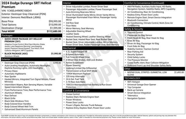 **LOCAL TRADE**, RED SEATS, 112,680 MSRP, Durango SRT Hellcat, 4D Sport Utility, 6.2L Supercharged HEMI V8 SRT, 8-Speed Automatic, AWD, Destroyer Gray Clearcoat, Demonic Red/Black Leather, 1 USB Charging Port in Console, 12V Auxiliary Power Outlet In Console, 19 harman/kardon Amplified Speakers w/Subwoofer, 2nd Row Console w/Armrest & Storage, 3rd Row Floor Mat & Full Console, 7 & 4 Pin Wiring Harness, 825 Watt Amplifier, Adaptive Cruise Control w/Stop, Advanced Brake Assist, AM/FM radio: SiriusXM w/360L, Black Package, Blind Spot w/Trailer Detection, Class IV Receiver Hitch, Eclipse Black Exhaust Tips, Forged Carbon Fiber Interior Accents, Full Speed Forward Collision Warning Plus, Gray Metallic Badges, High Performance Laguna Leather Seats, Illuminated entry, Illuminated Rear Cupholders, Lane Departure Warning Plus, Memory seat, Navigation system: TomTom, Power Liftgate, Power Sunroof, Quick Order Package 2XY Hellcat Premium, Red Seat Belts, Satin Black Dodge Tail Lamp Badge, Suede Headliner, Trailer Brake Control, Wheels: 20 x 10 Lights Out Aluminum. Odometer is 1956 miles below market average!