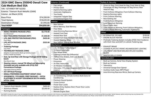 Sierra 2500HD Denali, 4D Crew Cab, Duramax 6.6L V8 Turbodiesel, 12-Way Power Driver Seat Adjuster w/Lumbar, 12-Way Power Passenger Seat Adjuster w/Lumbar, 120-Volt Bed Mounted Power Outlet, 120-Volt Instrument Panel Power Outlet, 2 Charge-Only Rear USB Ports, 2 Charge/Data USB Ports Inside Center Console, 2 USB Ports, 2-Speed Active Transfer Case, Adaptive Cruise Control, Bed View Camera w/2 Trailer Camera Provisions, Bose Premium 7-Speaker Sound System, Denali Reserve Package, Driver Memory, Front Rain-Sensing Wipers, GMC Connected Access Capable, Gooseneck/5th Wheel Prep Package, HD Surround Vision, Heated 2nd Row Outboard Seats, Inside Rearview Auto-Dimming Rear Camera Mirror, Integrated Trailer Brake Controller, LED Cargo Area Lighting, LED Smoked Amber Roof Marker Lamps, Manual Tilt-Wheel/Telescoping Steering Column, Max Trailering Package, Multicolor 15 Diagonal Head-Up Display, OnStar & GMC Connected Services Capable, Polished Exhaust Tip, Power Sliding Rear Window w/Defogger, Preferred Equipment Group 5SA, Rear Cross Traffic Alert, Rear Wheelhouse Liners, Safety Alert Seat, Signature Chrome Denali Grille, SiriusXM w/360L, Spray-On Bedliner w/Denali Logo, Steering Wheel Audio Controls, Technology Package, Trailer Cam Provisions & Trailer Viewing Software, Trailer Side Blind Zone Alert, Ultrasonic Front & Rear Park Assist, Universal Home Remote, Wireless Charging, Wireless Phone Projection, X31 Off-Road Package. Odometer is 5028 miles below market average!